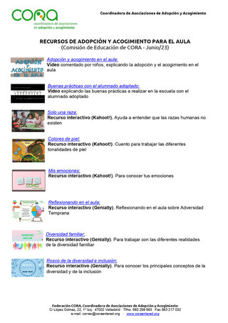Desde la Comisión de Educación de CORA, se han realizado los siguientes recursos para trabajar con los alumnos y las alumnas en el aula, en diferentes formatos visuales e interactivos, en los que se pueden abordar temas como la adopción, el acogimiento, la adversidad temprana, la diversidad personal y familiar, el racismo, etc.